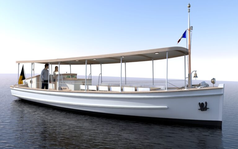 The 39ft Dunkirk little ship Jeff was built for Thames pleasure trips in 1923, by J Mears of Richmond. She was, until recently, one of the most original of the fleet of Dunkirk little ships, She’s now at VMG Yachtbuilders for restoration. Olivier van Meer Design redesigned her deklayout to give her a new live as a luxury canalcruiser.